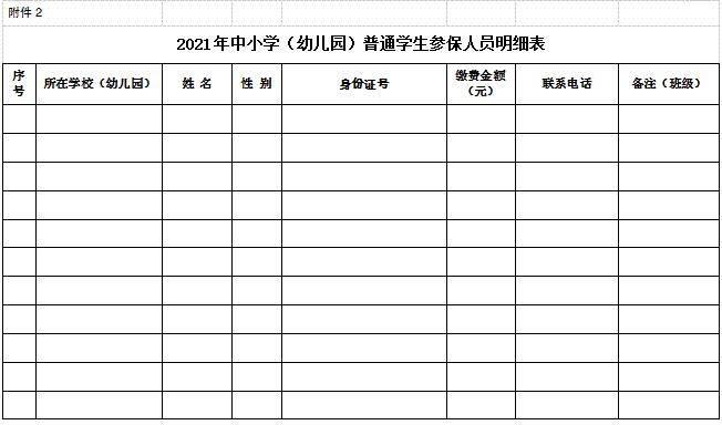 (四)县教育部门负责配合税务和医保部门,督促各城乡中小学校和幼儿园进行集中全员缴费,并按时填报《2021年普通中小学、幼儿园参保人员明细表》(附件2);各学校和幼儿园缴费结束后第一时间将参保费缴到税务部门指定账户。