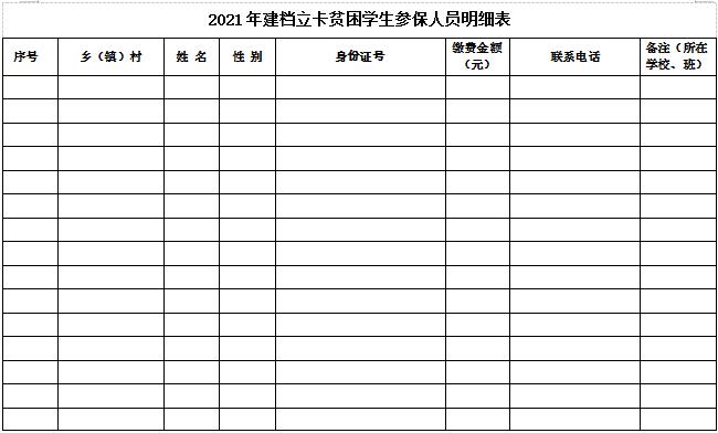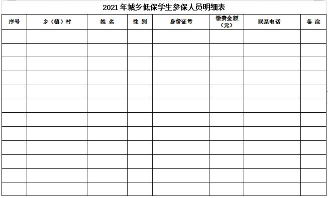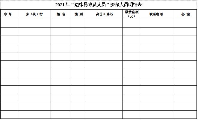 1.各相关部门的参保缴费工作要在2020年12月10日前全面完成,建档立卡贫困人口及农村低保对象、五保户、孤儿、“边缘易致贫人员”参保率要达到100%。教育部门及各乡(镇)场在参保缴费过程中要及时填报表格(教育部门填报附件2;各乡(镇)场填报附件3),从10月20日起于每周五下班前将前期参保累计情况报送县税务部门,在12月10日前报送最终汇总统计表。